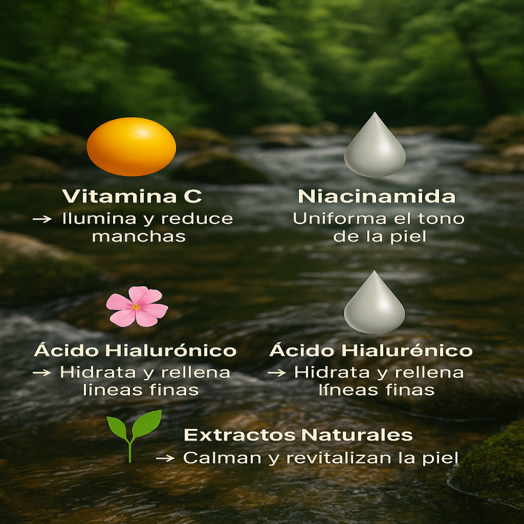 🌟 Vitamina C → Aporta luminosidad inmediata y ayuda a reducir manchas para una piel más radiante. 🌸 Niacinamida → Uniforma el tono y mejora la textura de la piel, dejándola suave y equilibrada. 💧 Ácido Hialurónico → Proporciona hidratación profunda y rellena líneas finas para un efecto de piel jugosa. 🌿 Extractos Naturales → Calman, revitalizan y nutren la piel, aportando frescura y bienestar.